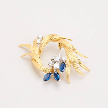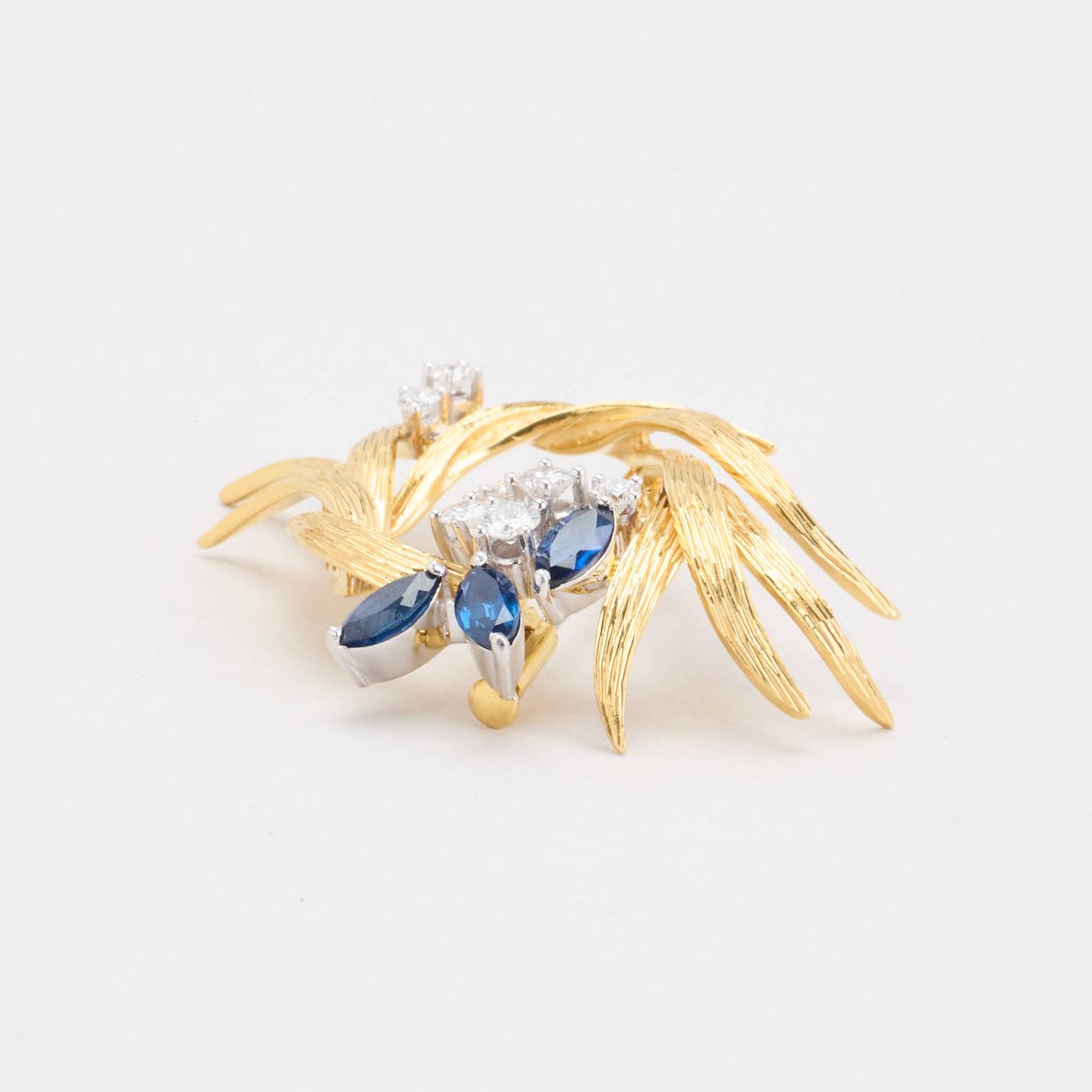 BROOCH IN 18K GOLD AND WHITE GOLD, WITH DIAMONDS (0.7 CT) AND SAPPHIRES, LENGTH 2.9 CM