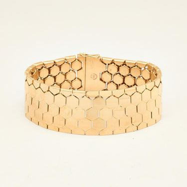 Beim Kauf von Vintage-Armbändern aus massivem Gold mit Bienenstockmotiven werden zeitlose Details und skulpturale Formen geschätzt. Diese Armbänder bieten eine beeindruckende Kombination aus Textur und Form und werden oft von traditionsreichen Ateliers mit jahrzehntelanger Erfahrung in der Schmuckherstellung handgefertigt. Das einzigartige Bienenstockmotiv, inspiriert von der natürlichen Geometrie, verleiht jedem Stück Tiefe und Charakter.